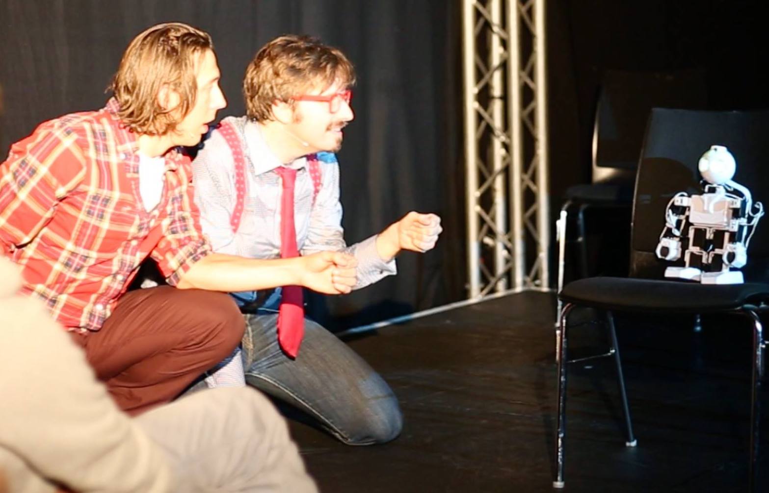 Mathewson (as mYleZ) and Mirowski (as Albert), alongside A.L.Ex. the improvisational theatre robot and an enthusiastic audience member at the Edinburgh Fringe Festival 2017 in Edinburgh, Scotland.