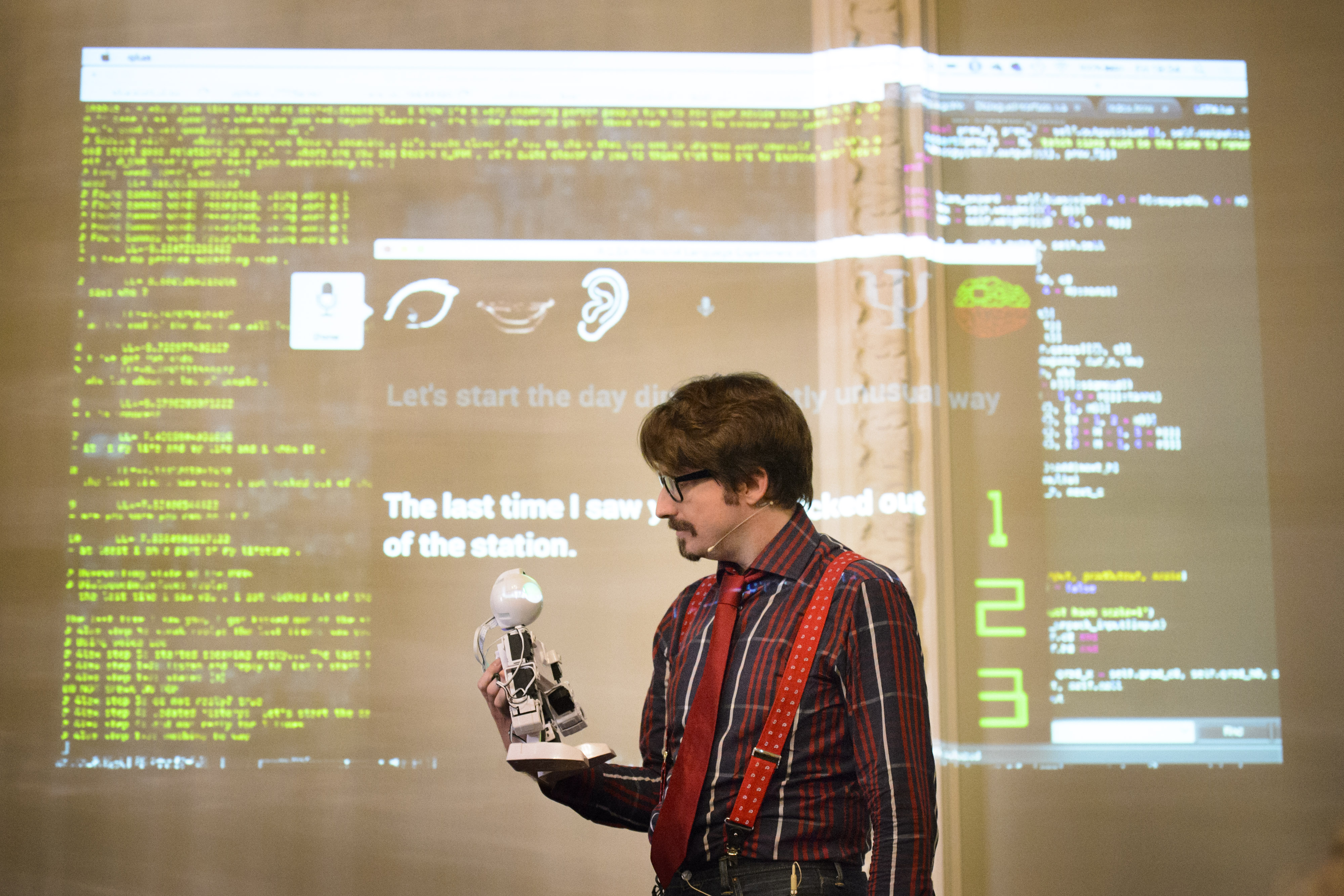 Albert and A.L.Ex premiered in London in July 2016. While this was a first in the UK and in Europe, the credit for the world’s first AI-assisted improv goes to Piotr’s friend and collaborator Kory Mathewson, from Rapid Fire Theatre in Edmonton, Alberta, who first performed in April 2016. Kory based his artificial improvisor, Piggy, on a chatbot and explored the idea of an embodied improv avatar. Kory’s work as a talented improviser, touring globally and combining his research in AI with improv, has been recognised in the Top 40 Under 40 list of the Edmonton Avenue.
