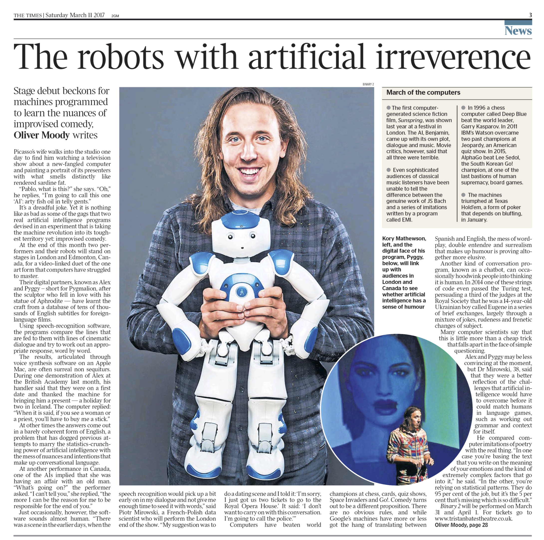 “Meet the smart robots with artificial irreverence“, by Oliver Moody for The Sunday Times, 11 March 2017 (pdf version).